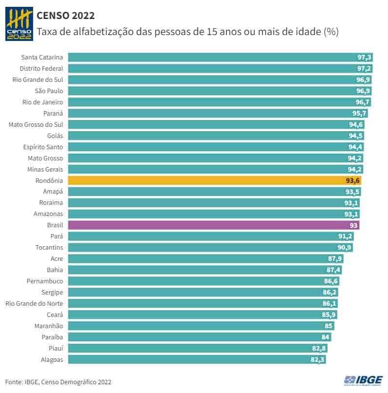 Com as informações do Censo, é possível observar que os estados do Nordeste têm as menores taxas de alfabetização do país, sendo seguidos pelos estados do Norte. Alagoas (82,3%), Piauí (82,8%) e Paraíba (84%) registraram as menores taxas do Brasil. Já as maiores foram em Santa Catarina (97,3%), no Distrito Federal (97,2%) e em São Paulo (96,9%) e no Rio Grande do Sul (96,9%).