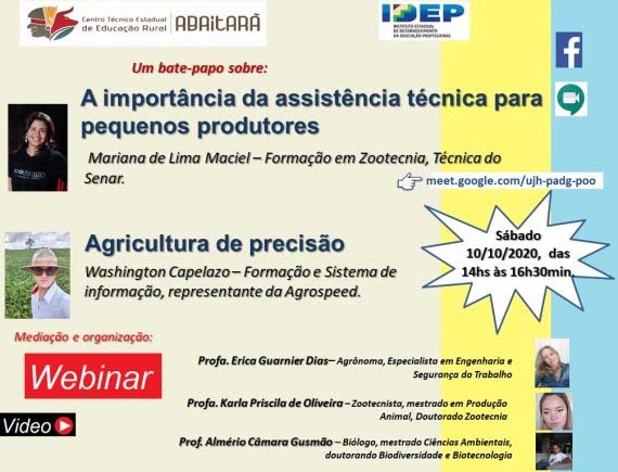Centro Técnico Estadual de Educação Rural – Centec Abaitará, realiza no próximo sábado (10) ás 14h o Webinar , que é um bate-papo virtual sobre temas relacionados a agricultura para os estudantes, profissionais da área, pesquisadores, produtores rurais, empresas, representante de empresas ligados ao Agro.
