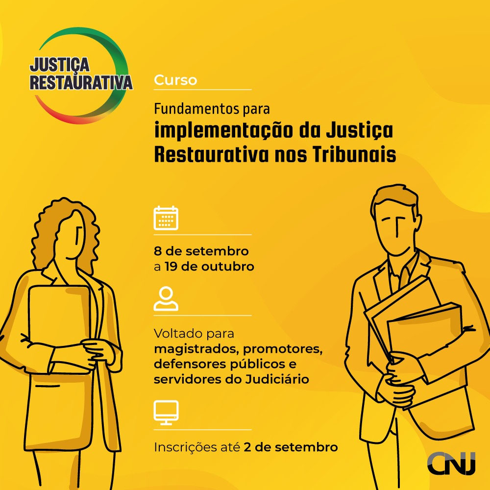 Começa nesta terça-feira (8/9) as atividades do curso Fundamentos para Implementação da Justiça Restaurativa nos Tribunais. Realizado pelo Conselho Nacional de Justiça (CNJ) e a Escola Nacional de Formação e Aperfeiçoamento de Magistrados (Enfam), a capacitação vai até 19 de outubro.