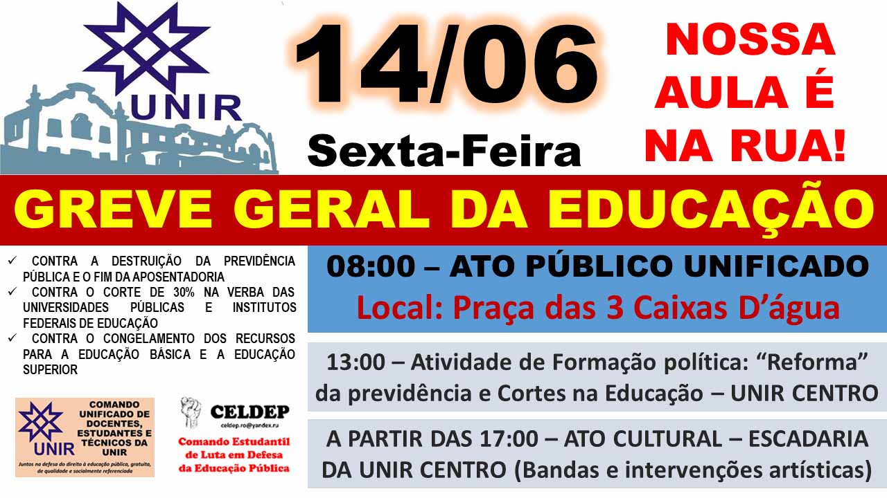 Em virtude dos cortes no orçamento da educação, acadêmicos, técnicos e estudantes da UNIR definiram cruzar os braços em uma greve de 24 horas na próxima sexta-feira. Segundo o Comando Unificado da UNIR, a greve do próximo dia 14 (sexta-feira) tem como pauta a defesa da educação pública, contra os cortes de verbas e contra a reforma da previdência. Uma programação extensa inclui um ATO UNIFICADO, convocada por sindicatos e o movimento estudantil (centros acadêmicos e grêmios), que ocorrerá às 08:00 da manhã na praça das 3 caixas d’água. Na parte da tarde a programação incluirá atividades de formação e debate na UNIR Centro e à partir das 17h ocorrerão atividades culturais. Segundo Carlos Henrique, estudante de pedagogia e integrante do Comando Unificado, “a proposta é um dia de protesto, formação e integração da comunidade universitária que visam chamar a atenção dos ataques que a educação vem sofrendo”.