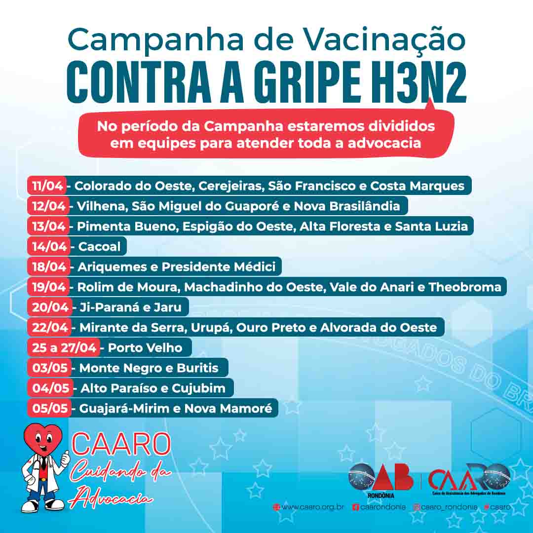Teve início nesta segunda-feira, 11 de abril, a campanha de vacinação contra a gripe, realizada pela Caixa de Assistência dos Advogados (CAARO), braço assistencial da OAB Rondônia. As primeiras cidades contempladas serão Costa Marquês e Colorado do Oeste.
