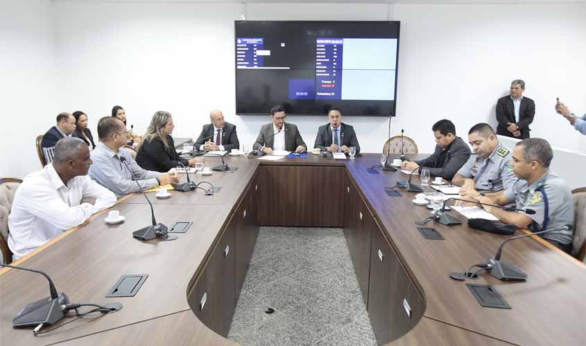 O coronel Rildo Flores, subcomandante da PM, a secretária adjunta de Educação (Seduc), Maria da Conceição, o presidente do Sindicato dos Vigilantes, Paulo Tico, e o presidente da Comissão dos Vigilantes, Daniel Silva, participaram da reunião.