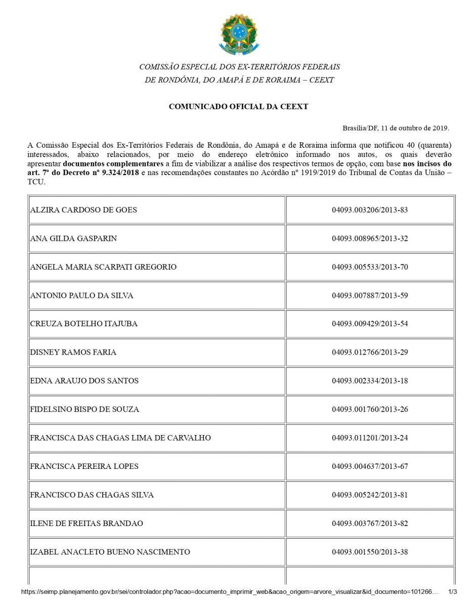 A Comissão Especial dos Ex-Territórios de Rondônia, Amapá e Roraima (CEEXT), pediu por meio um comunicado oficial, no dia 11/10, a complementação dos documentos de 40 servidores de Rondônia para conclusão da análise e julgamento dos processos.