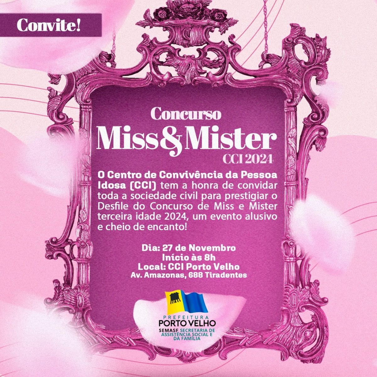 O Concurso Miss e Mister Melhor Idade 2024 do Centro de Convivência do Idoso (CCI), da Secretaria Municipal de Assistência Social e da Família (Semasf), da Prefeitura de Porto Velho, será realizado nessa quarta-feira (27). O concurso será de 8h às 12h, na sede do Centro, na avenida Amazonas, 688, bairro Tiradentes.