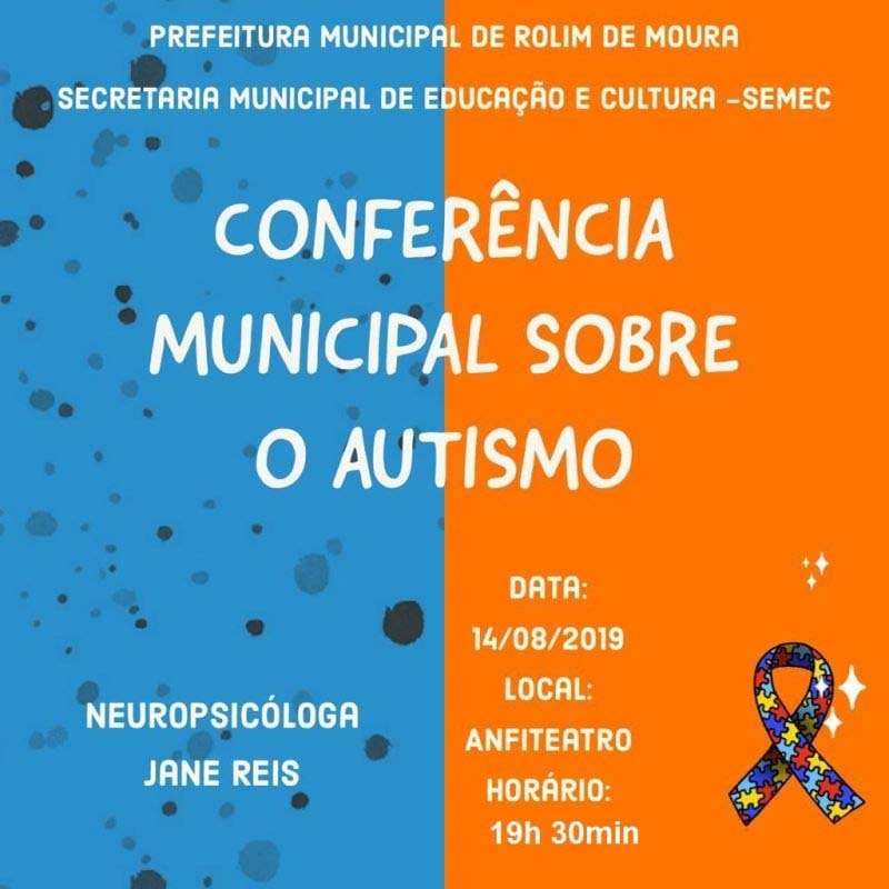 A prefeitura de Rolim de Moura (RO), por intermédio da Secretaria Municipal de Educação e Cultura (SEMEC) realizará nesta quarta-feira, (14/08), a partir das 19h 30min, no anfiteatro Municipal Francisca Verônica de Carvalho, a primeira conferência municipal sobre Autismo.