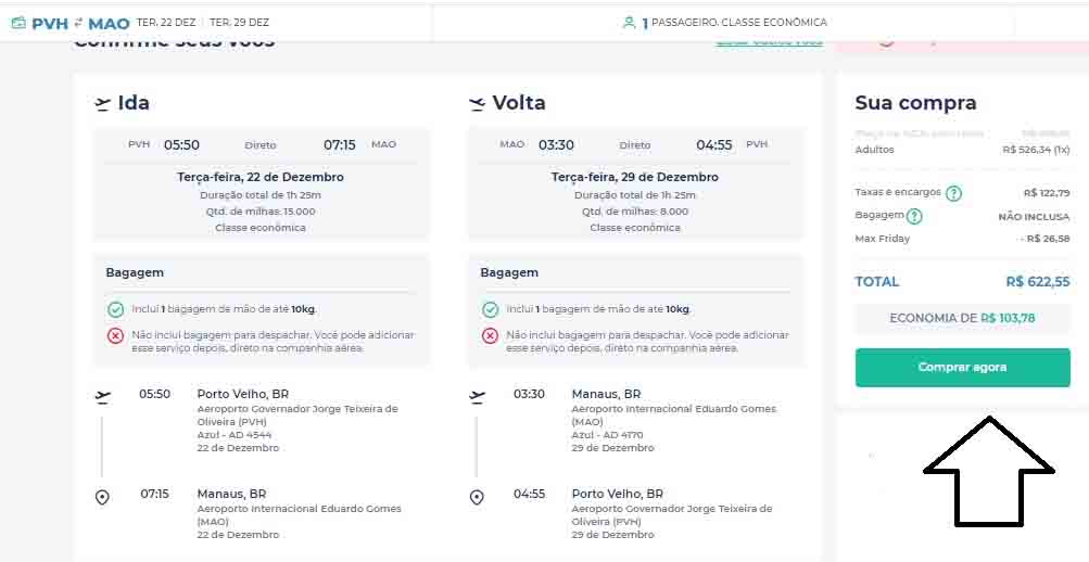 Uma das formas de garantir passagens aéreas promocionais nos voos do Norte do Brasil é garantir a compra dos bilhetes com antecedência. A outra forma é aproveitar as promoções da Black Friday 2020. A nossa equipe selecionou os menores preços para quem está em Rondônia e no Acre e tem planos de viajar nos próximos meses. De Porto Velho para Manaus, para viagem no mês de dezembro, em voo direto da Azul, as passagens de ida e volta custam R$ 622,55. (Veja detalhes na imagem acima).