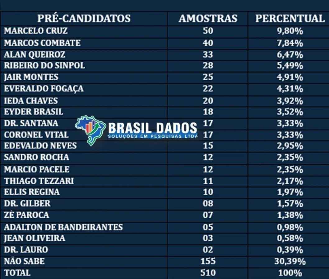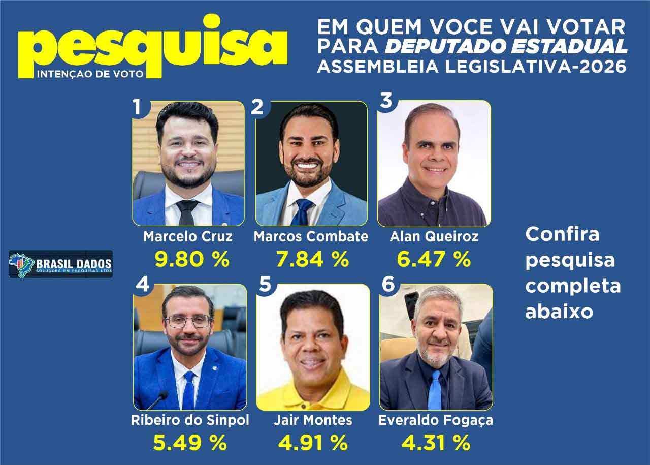 Segundo o levantamento, Marcelo Cruz aparece na liderança com 9,80% das intenções de voto, seguido por Marcos Combate, com 7,84%, e Alan Queiroz, com 6,47%. A forte presença de parlamentares já conhecidos pelo eleitorado indica que a disputa poderá ser acirrada nos próximos meses.