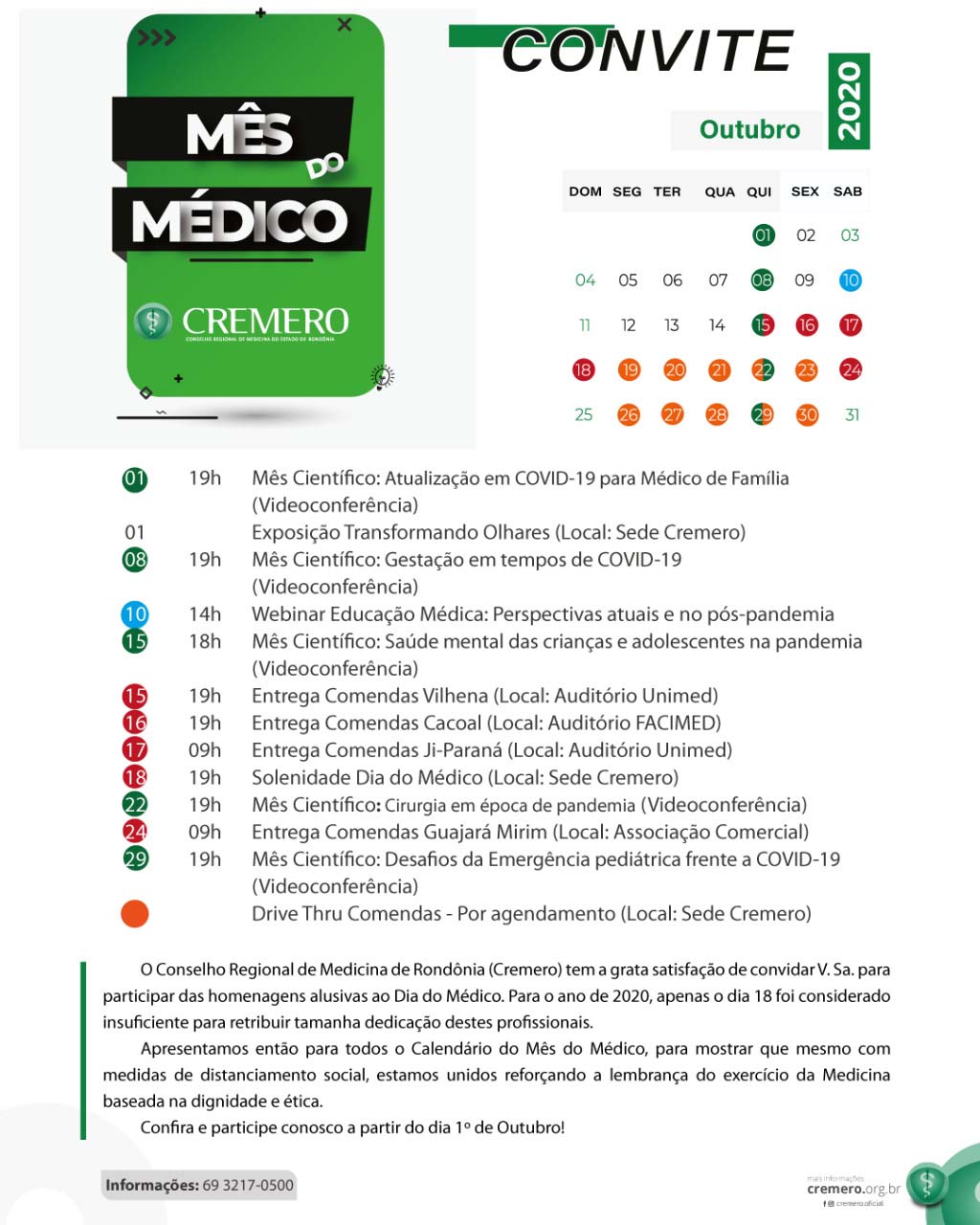 O Conselho Regional de Medicina de Rondônia (Cremero) tem a grata satisfação de convidá-los para participar das homenagens alusivas ao Dia do Médico. Para o ano de 2020, apenas o dia 18 foi considerado insuficiente para retribuir tamanha dedicação destes profissionais. Apresentamos então para todos o Calendário do Mês do Médico, para mostrar que mesmo com medidas de distanciamento social, estamos unidos reforçando a lembrança do exercício da Medicina baseada na dignidade e ética.