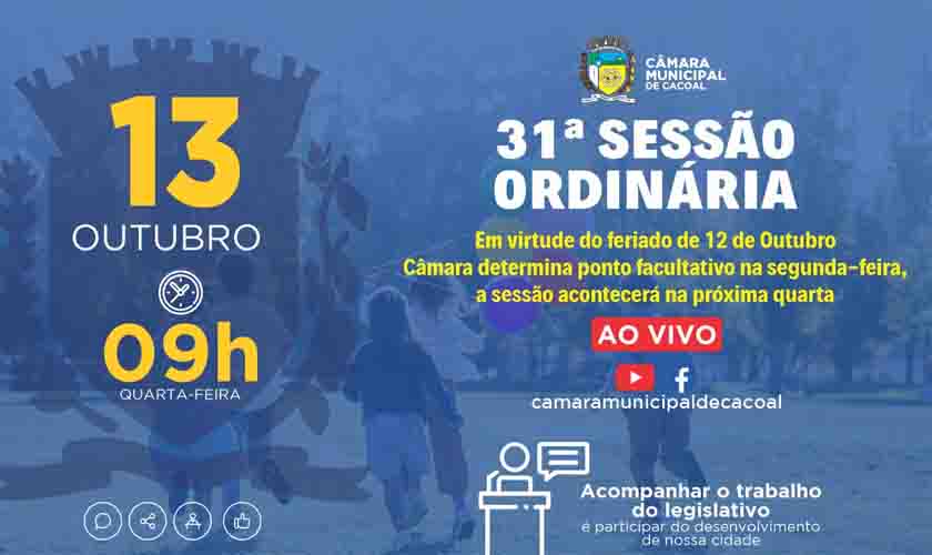 Com ponto facultativo em razão do feriado de 12 de outubro, a 31ª sessão ordinária da Câmara será na quarta-feira dia 13