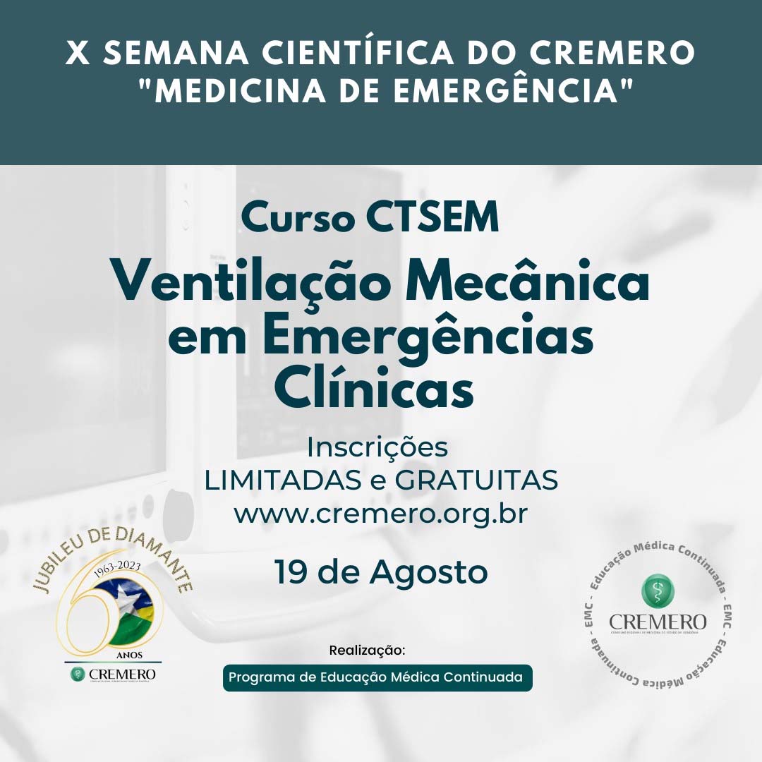 O Conselho Regional de Medicina do Estado de Rondônia (Cremero) abre inscrições gratuitas para o Curso de Ventilação Mecânica em Emergências Clínicas durante X Semana Científica que acontece na próxima semana, entre os dias 15 e 19 de agosto.