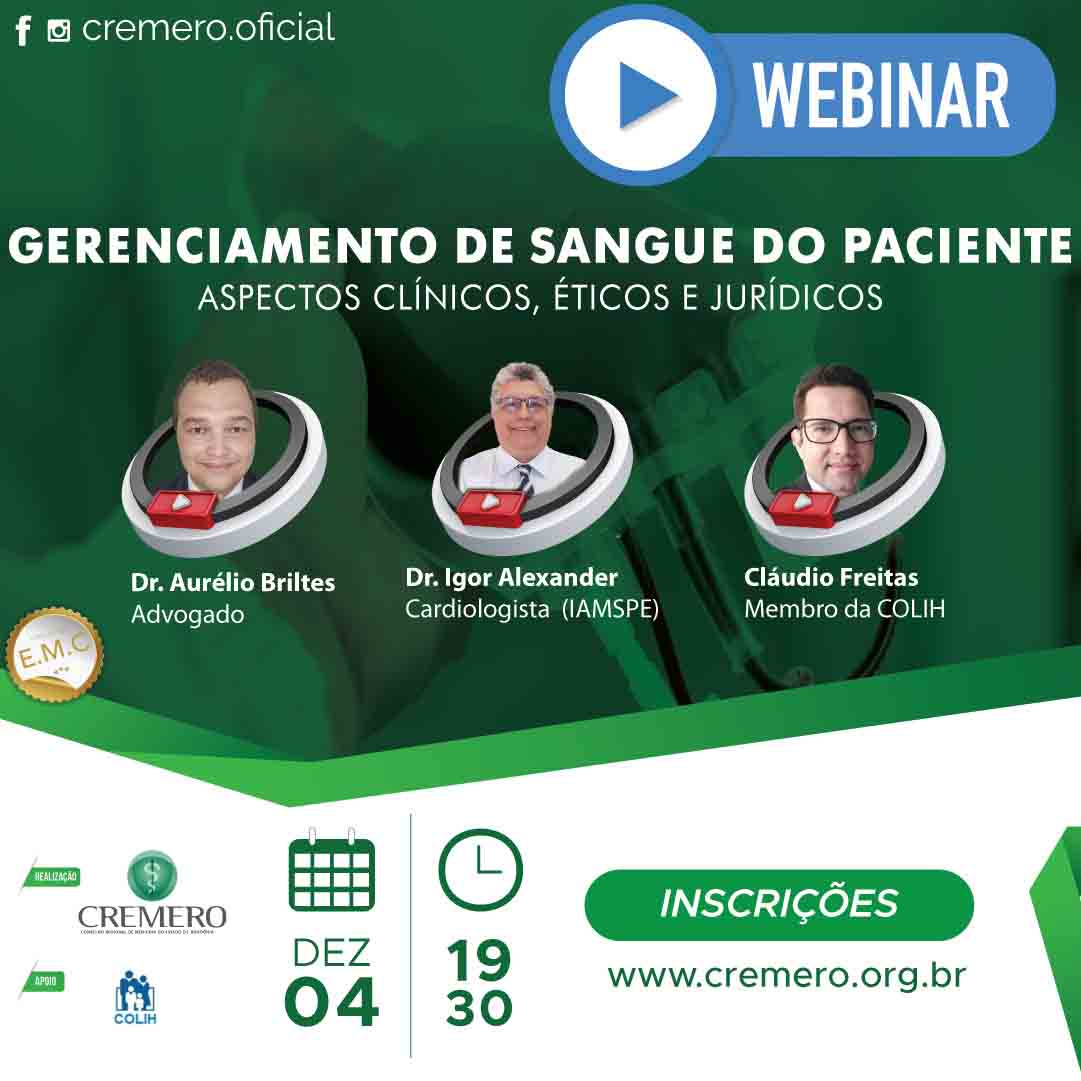 O Programa Educação Médica Continuada (EMC) do Conselho Regional de Medicina do Estado de Rondônia (Cremero), promove nesta sexta-feira (04), a partir das 19h30 o Webinar “Gerenciamento de Sangue do Paciente: Aspectos Clínicos, Éticos e Jurídicos”. O encontro virtual está com inscrições gratuitas e abertas pelo site www.cremero.org.br e é direcionado para médicos, profissionais da saúde e estudantes.