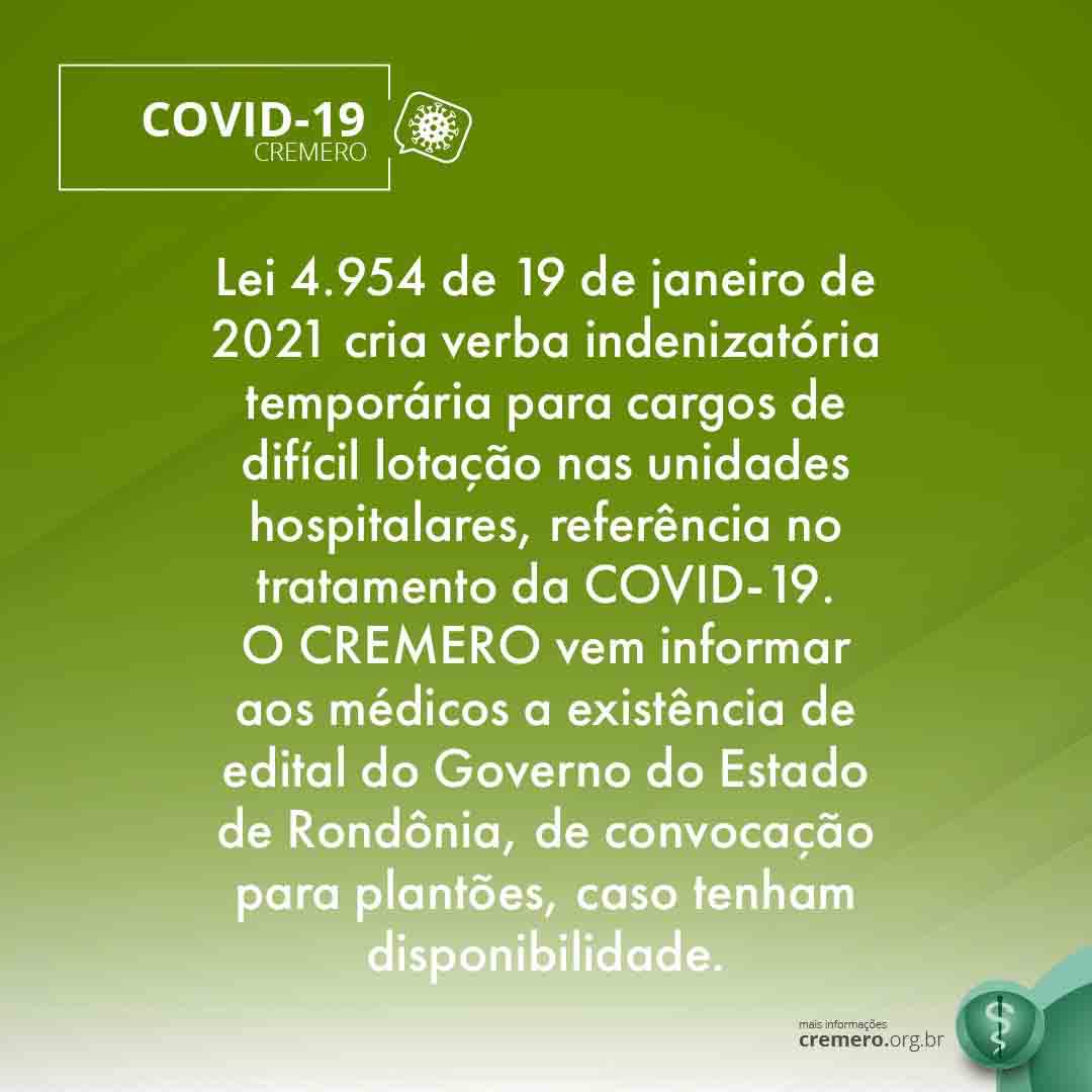 Diante do pedido feito pela Secretaria de Saúde do Estado de Rondônia (SESAU), através do Ofício nº 1154/2021/SESAU-GAB, recebido e protocolado no CRM sob o n° 0250/2021, no último dia 25, o Conselho Regional de Medicina do Estado de Rondônia (Cremero), reforça a divulgação aos seus profissionais sobre a Lei n° 4.954, de 19 de janeiro de 2021, que cria a verba indenizatória temporária para cargos de difícil provimento ou de difícil lotação nas unidades hospitalares, referência no tratamento da COVID-19 ou que disponham de leitos para tratamento exclusivo para tratamento da doença.