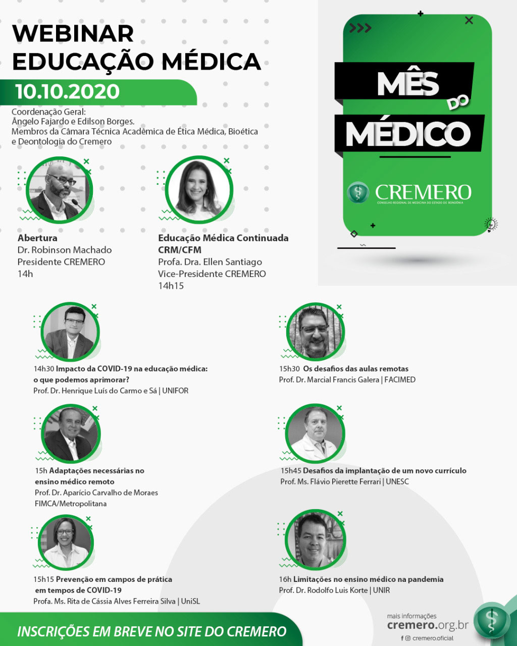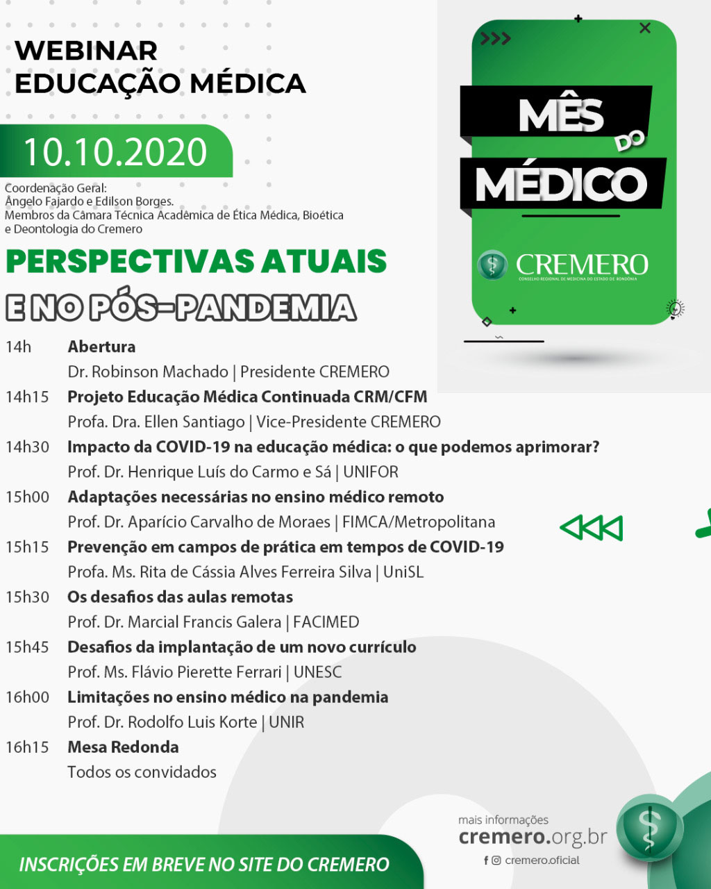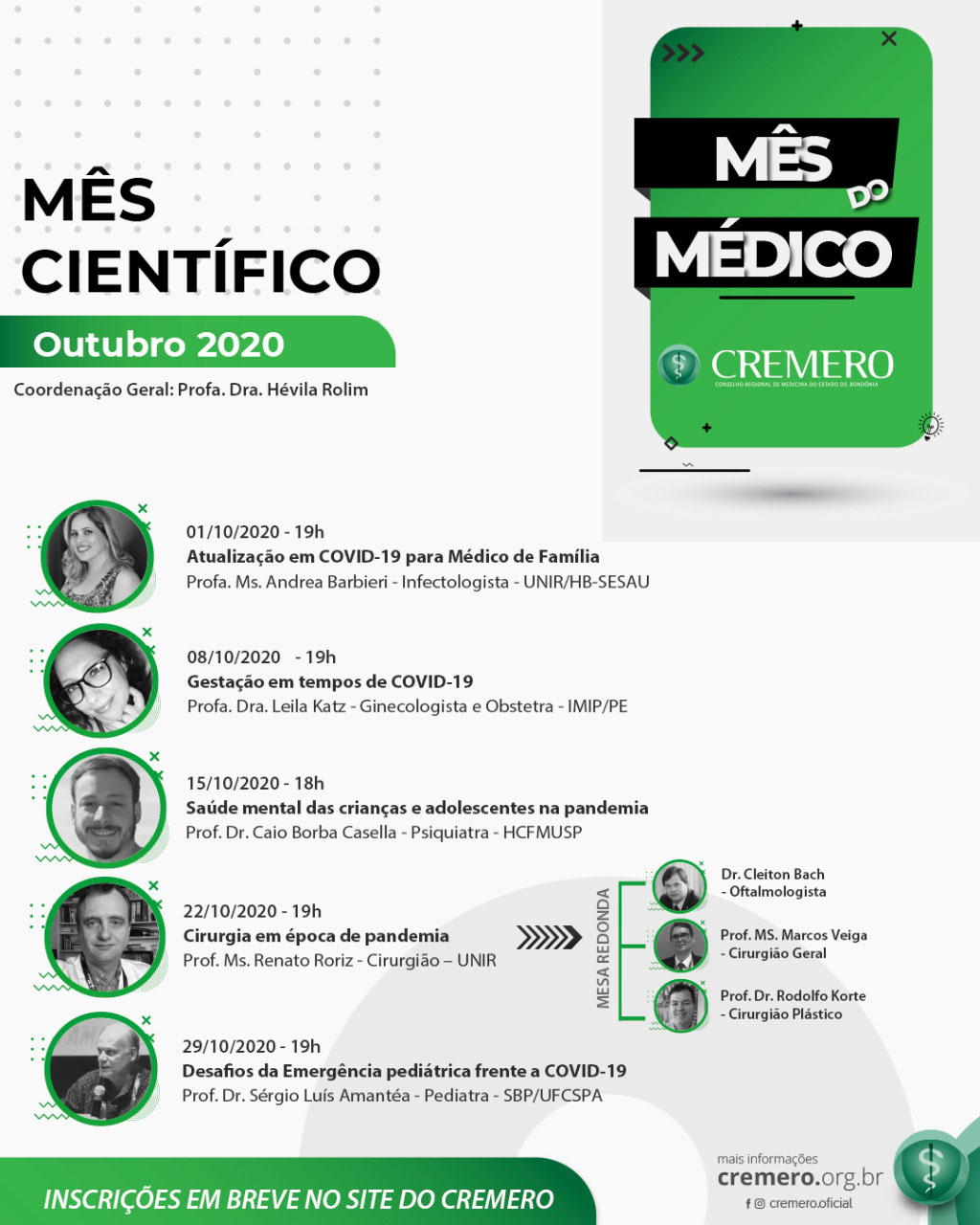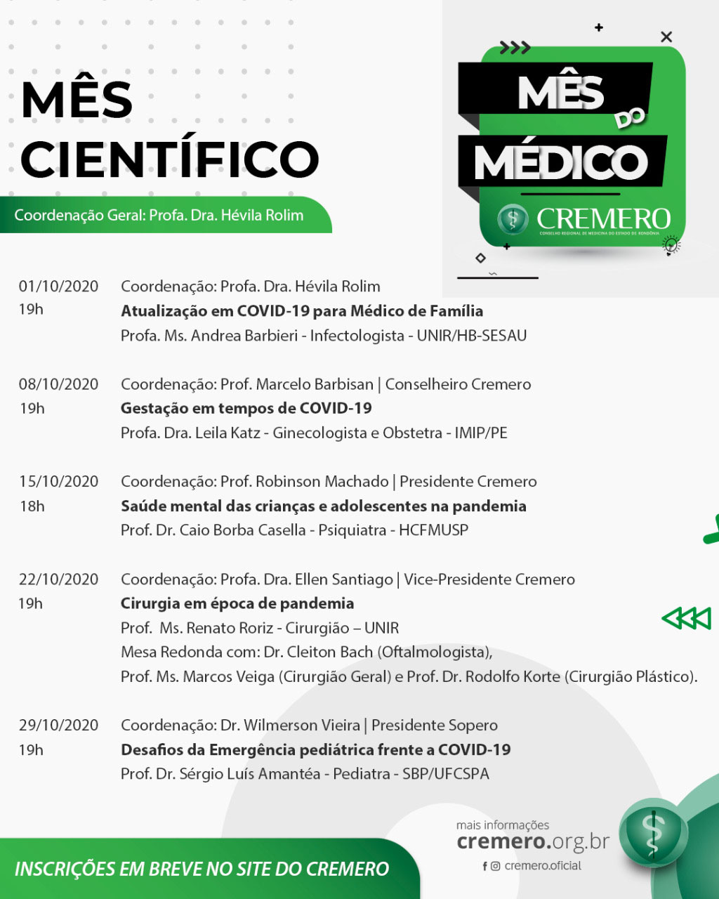 A programação inicia com a exposição fotográfica “Transformando Olhares” de André François que estará na sede do Cremero durante todo o mês para os visitantes. Também na mesma quinta-feira (01) iniciará o cronograma do Mês Científico com palestras agendadas para todas as quintas-feiras do mês que serão transmitidas por videoconferência com a participação de médicos renomados de todo Brasil. “Somado às quintas-feiras científicas, no dia 10 teremos o Webinar Educação Médica promovido pelos alunos da UNIR e Membros da Câmara Técnica Acadêmica de Ética Médica, Bioética e Deontologia do Cremero, Ângelo Fajardo e Edilson Borges com o tema ‘Perspectivas atuais e no pós-pandemia’. Serão momentos únicos para compartilhar conhecimento tanto entre acadêmicos da área da saúde em geral quanto médicos. As inscrições serão abertas em breve e divulgadas pelas mídias sociais e site www.cremero.org.br. Acompanhem”, destacou a coordenadora geral do Mês Científico, Dra. Hévila Rolim.