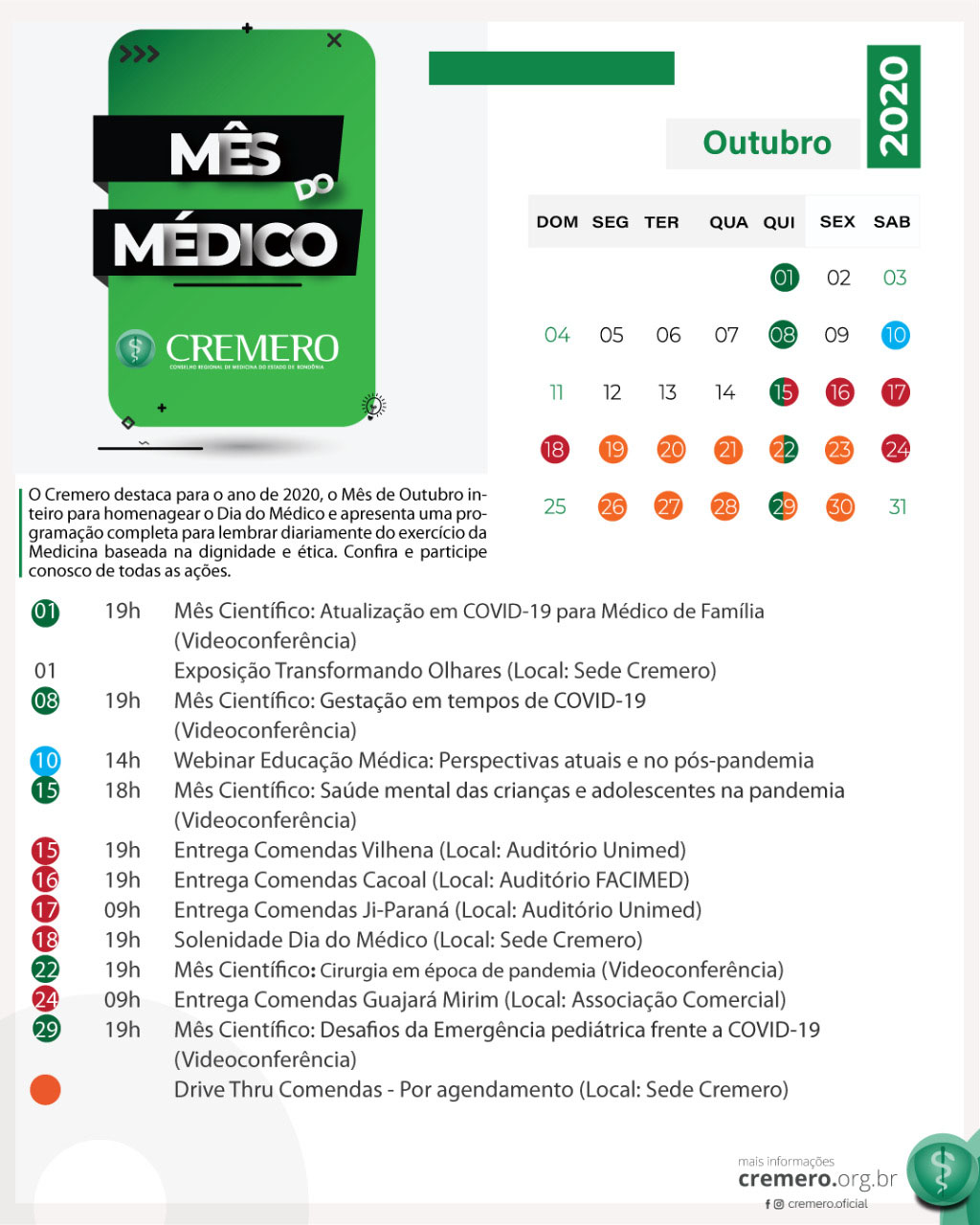 As solenidades acontecerão nos dias 15, 16, 17, 18 e 24 nas respectivas cidades de Vilhena, Cacoal, Ji-Paraná, Porto Velho e Guajará Mirim. E os Drive Thrus de Comendas em Porto Velho conforme destacado no calendário (vide foto). “São muitas outras surpresas que a sociedade verá neste mês. Pedimos que fiquem atentos as mídias e esperamos que de todo o coração todos se sintam abraçados pelo Conselho Regional de Medicina do nosso Estado”, reforçou a vice presidente Dra. Ellen Santiago.