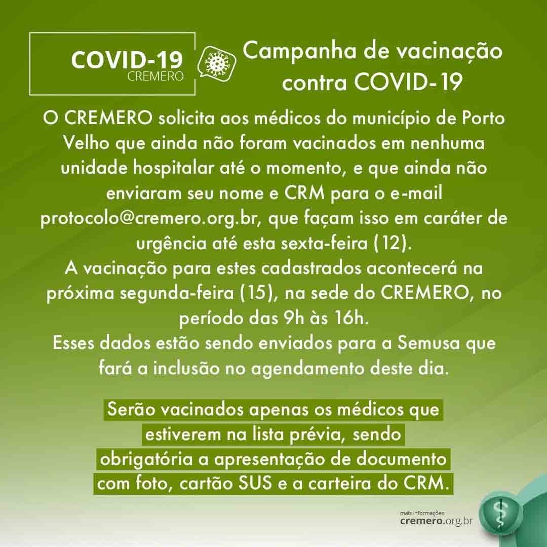 O Conselho Regional de Medicina do Estado de Rondônia (Cremero) solicita aos médicos do município de Porto Velho que ainda não foram contemplados pela Campanha de Vacinação contra Covid-19 em alguma das unidades hospitalares até o momento, e que ainda não enviaram seu nome e CRM conforme divulgado anteriormente pelo Conselho, que encaminhem estes dados para o e-mail [email protected], em caráter de urgência até esta sexta (12).