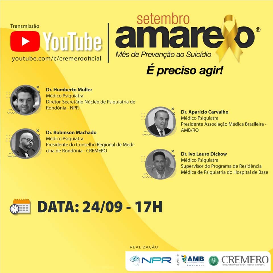 Segundo dados da OMS, mais de 800 mil pessoas morrem por suicídio a cada ano em todo o mundo, o que equivale a uma morte a cada 40 segundos. Por isso, milhões de pessoas são afetadas por casos de suicídio a cada ano, incluindo o luto. Estudos indicam que cada caso de suicídio tem sério impacto na vida de pelo menos outras seis pessoas de forma direta. Para tratar desses e outros assuntos que envolvem o setembro amarelo e que devem estar sempre claro e de fácil acesso à população, na tarde desta quinta-feira (24), as 17 horas acontecerá uma reunião com representantes do Núcleo de Psiquiatria de Rondônia (NPR), Associação Médica Brasileira de Rondônia (AMB/RO), Conselho Regional de Medicina do Estado (Cremero) e Programa de Residência Médica de Psiquiatria do Hospital de Base Ary Pinheiro. A reunião será transmitida pelo canal do Youtube Cremerooficial.