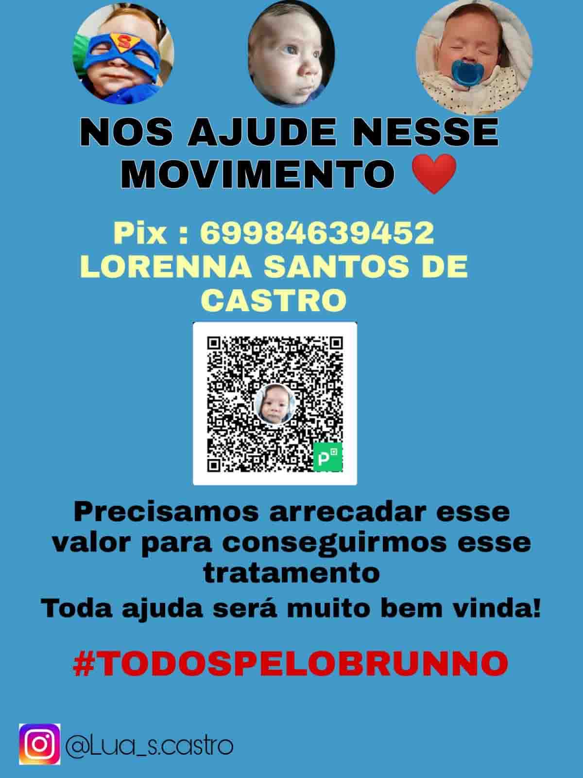 As doações podem ser realizadas via PIX: 69 984639452 (celular) em nome de Lorenna Santos de Castro, mãe de Brunno.