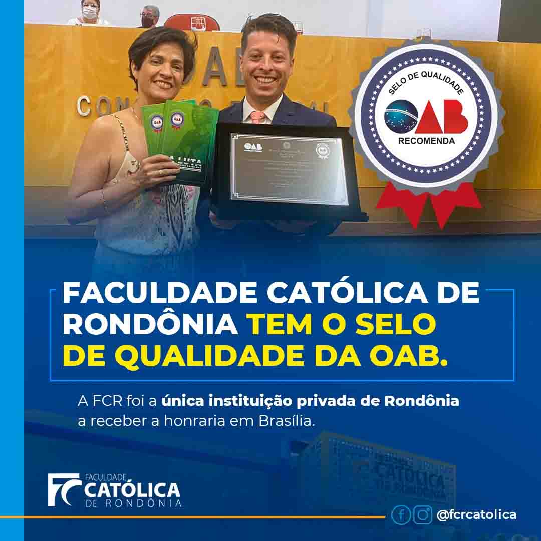 O curso de Direito da Faculdade Católica de Rondônia (FCR) recebeu, na última semana, o Selo de Qualidade da Ordem dos Advogados do Brasil (OAB), em cerimônia realizada em Brasília (DF). A honraria reconhece a qualidade do ensino jurídico oferecido pela FCR ao longo dos anos.