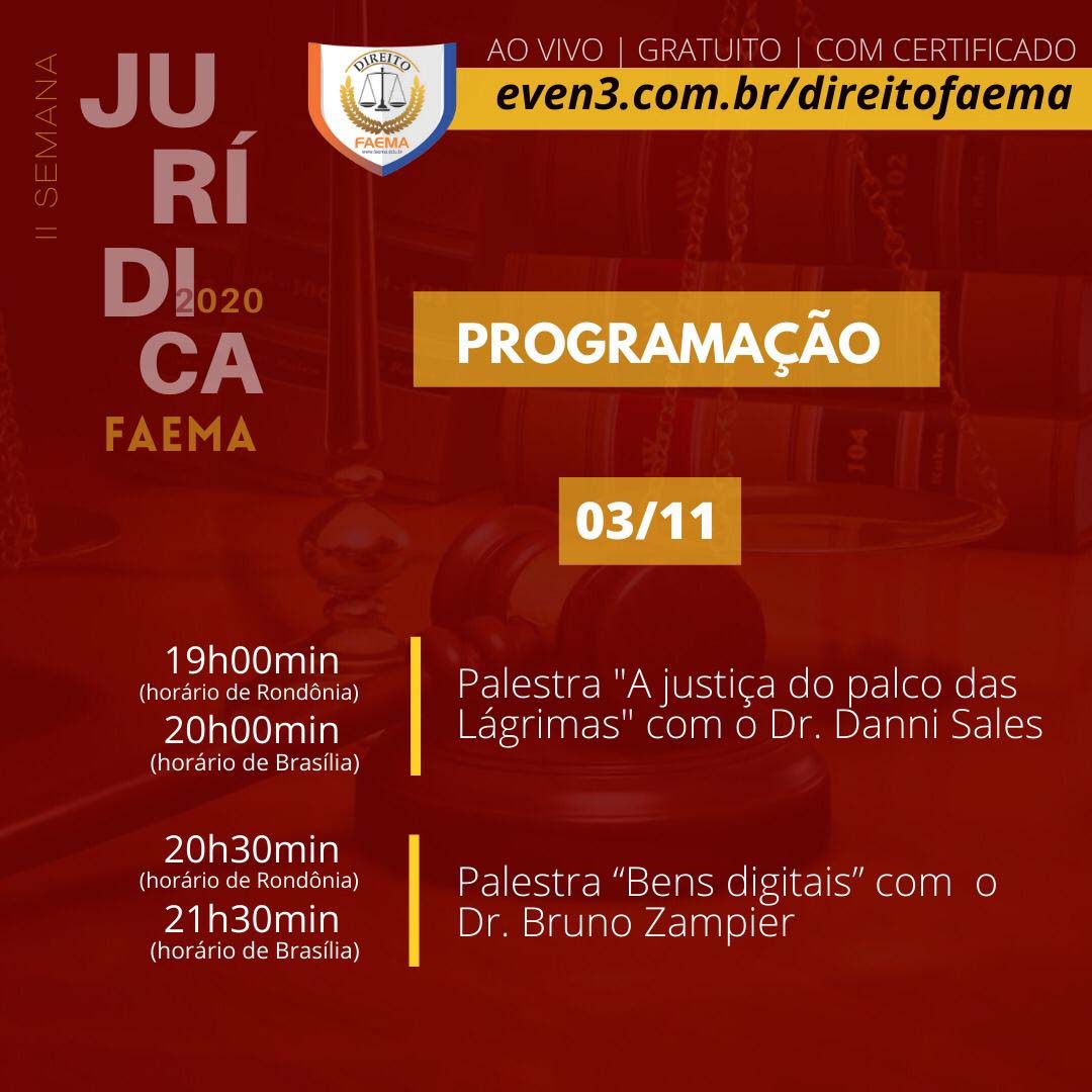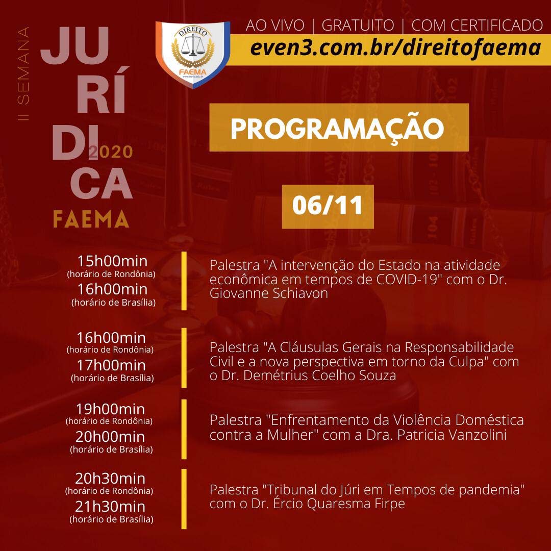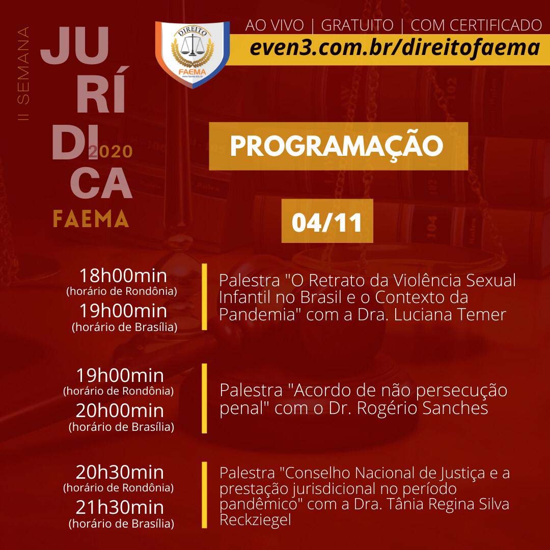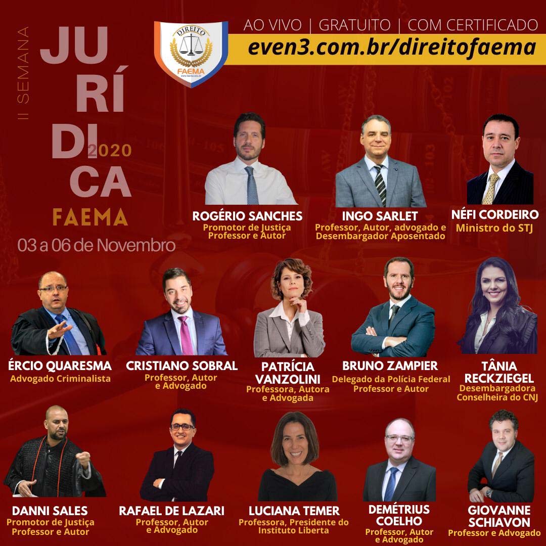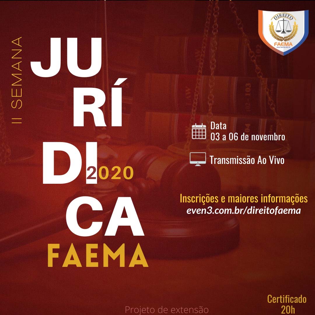 Entre os dias 03 a 06 de novembro de 2020, acontecerá a 2ª edição da Semana Jurídica da FAEMA, organizada pela Coordenação do curso de Direito.