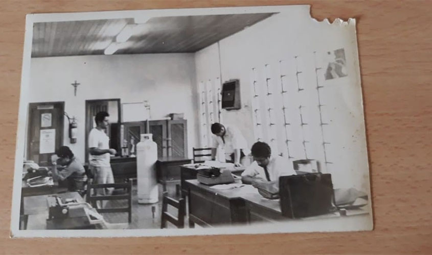 FOTO DO DIA: Jornal Alto Madeira (1917/2017), na redação recém inaugurada, caminhando, o secretário Rodrigo Pacheco; de frente, meio encurvado, o diretor de redação Ivan Marrocos (falecido em 1995) e à direita, sentado, o editor de cidade Nonato Cruz, ano de 1984.