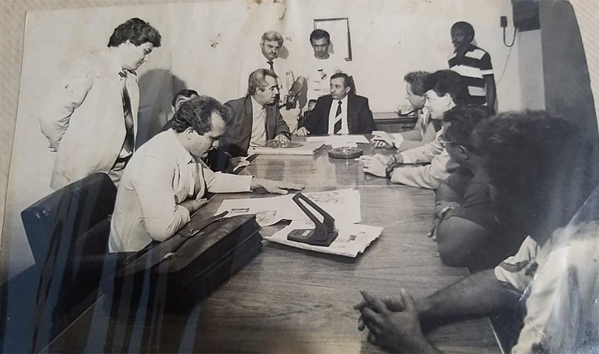 FOTO DO DIA: 1987 – O presidente da Assembleia Legislativa/RO, Sidney Guerra (na cabeceira da mesa, ainda na velha sede do parlamento rondoniense) debate com deputados propostas de criações de vários municípios. Pouco depois dessa reunião ele renunciaria para disputar a prefeitura de Jaru, em que foi eleito.