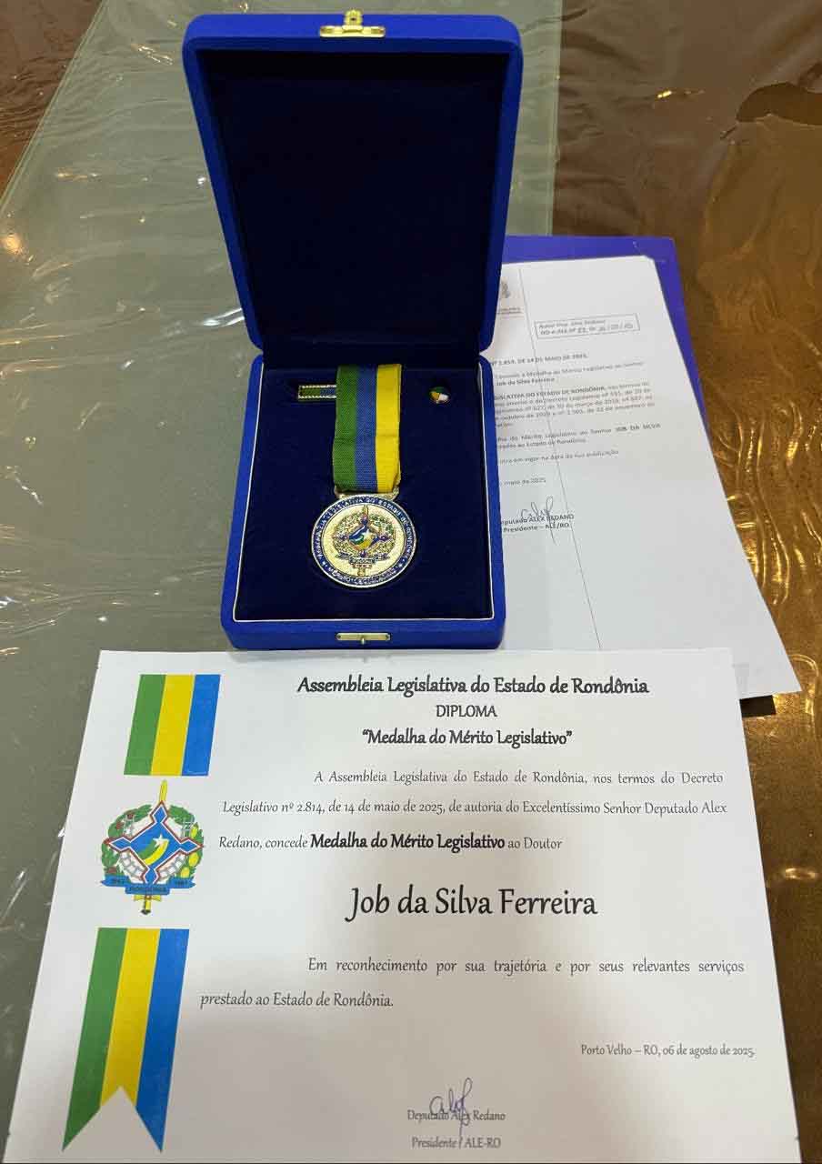 O advogado e empresário Job Ferreira foi homenageado no último dia 07, com a Medalha de Mérito Legislativo, uma das mais importantes honrarias concedidas pela Assembleia Legislativa do Estado de Rondônia. A medalha foi entregue pessoalmente pelo presidente da Casa, deputado Alex Redano, em reconhecimento à sua trajetória de vida e contribuição profissional para o estado.