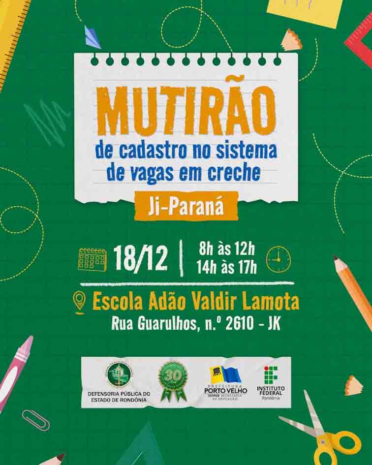 No próximo dia 18 de dezembro (sábado), a Defensoria Pública do Estado de Rondônia, em parceria com o Tribunal de Contas do Estado (TCE-RO), Instituto Federal de Rondônia (IFRO), e Secretaria Municipal de Educação de Ji-Paraná (SEMED), vai realizar, na Escola Municipal de Ensino Fundamental Adão Valdir Lamota, o Mutirão de Cadastro no sistema de vagas em creche, com horários das 8h às 12h e das 14h às 17h.