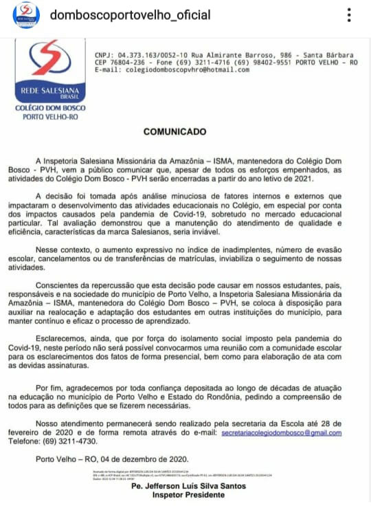 Por fim, no começo da tarde ainda da sexta-feira (04), um comunicado do presidente da Inspetoria Salesiana Missionária da Amazônia (ISMA), padre Jefferson Luís Silva Santos, mantenedora do Colégio Dom Bosco de Porto Velho, confirmou o encerramento das atividades. “Apesar de todos os esforços empenhados, as atividades do Colégio Dom Bosco – PVH serão encerradas a partir do ano letivo de 2021”.