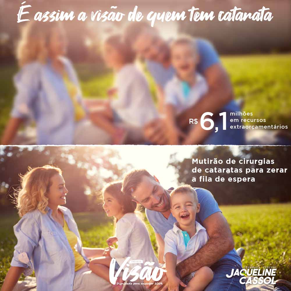 Para atender a população de Rondônia que aguarda na fila por uma cirurgia eletiva de catarata, a deputada federal Jaqueline Cassol (PP/RO) lançou o Programa Visão. Inicialmente a ação vai beneficiar moradores da região do Cone Sul, Zona da Mata, BR-429 e toda região Café, com recurso extraorçamentário de R$ 6,1 milhões destinados pela deputada federal Jaqueline Cassol. “Percebo que no estado de Rondônia muitos idosos estão perdendo a visão por não conseguir fazer a cirurgia. Portanto, assim que tive oportunidade, busquei uma forma de atender essas pessoas, que esperam há anos”, destacou a parlamentar.