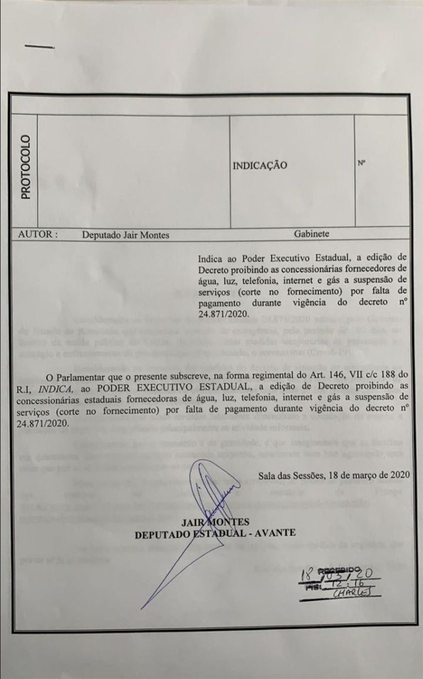 O Deputado Estadual, Jair Montes indicou ao Poder Executivo Estadual, a edição de Decreto proibindo as concessionárias estaduais fornecedoras de água, luz, telefonia, internet e gás a suspensão de serviços (corte no fornecimento) por falta de pagamento durante vigência do decreto nº 24.871/2020.