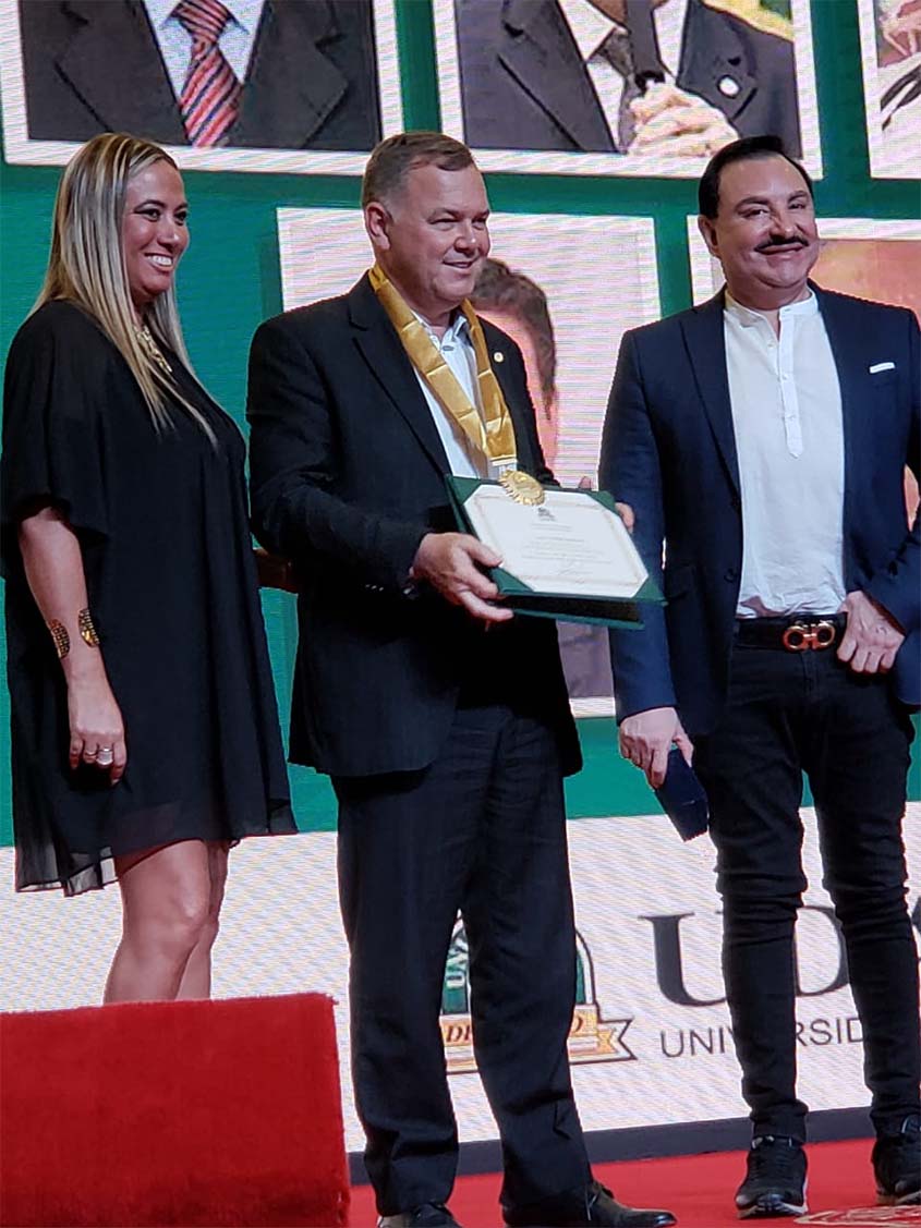 Após discursar e falar de sua luta no Congresso Nacional em prol dos brasileiros que estão estudando no exterior, o deputado Lucio Mosquini recebeu do Presidente da UDABOL uma medalha de Visitante Ilustre, que é a mais alta condecoração da instituição.