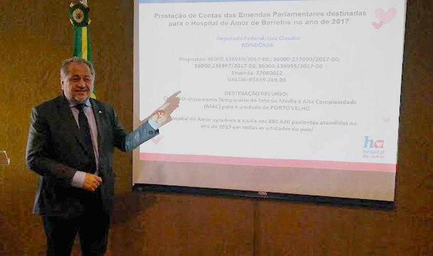 O deputado Luiz Cláudio se disse feliz em poder contribuir com o hospital, ressalvando que uma das premissas cristãs é dar assistência e apoio a quem precisa, e através desse apoio ao hospital, tem certeza que está ajudando a minimizar o sofrimento de milhares de famílias que precisam de uma estrutura como a do Hospital de Amor.