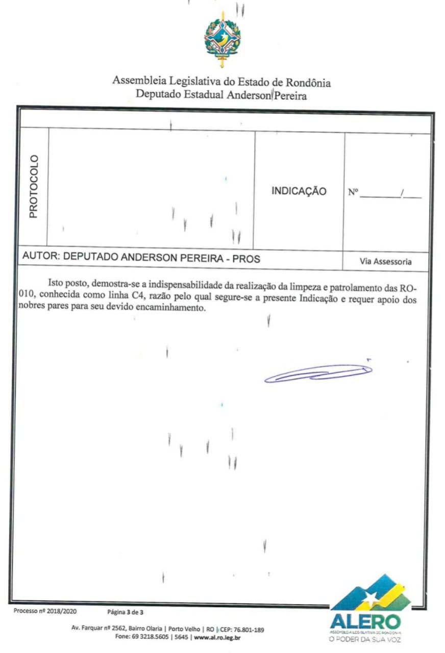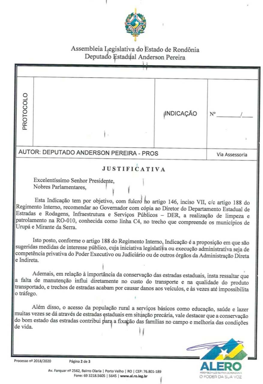Atendendo indicação do deputado estadual Anderson Pereira (PROS), o Departamento de Estradas e Rodagens (DER), realizou na última quarta-feira (28), serviços de limpeza e patrolamento em um trecho da RO 010, também conhecida como Linha C4, que compreende os municípios de Urupá e Mirante da Serra.