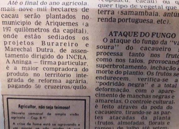 A empresa Aninga, maior compradora do produto no extinto território federal, pagava 50 cruzeiros o quilo e fecharia o ano com a aquisição de quatrocentas toneladas. Produtores enfrentavam a doença jogando sobre as plantas soluções à base de cobre. Entre eles, o baiano Carlos Guerreiro, dono de 250 hectares de lavouras, buscava salvar seus 48 mil cacaueiros em franca ascensão. Conseguira financiar 30 ha na agência do Banco do Brasil em Ariquemes, apresentando projeto da Ceplac, e queria dinheiro para mais 20 ha. Ao mesmo tempo, ele cultivava arroz, feijão e milho.