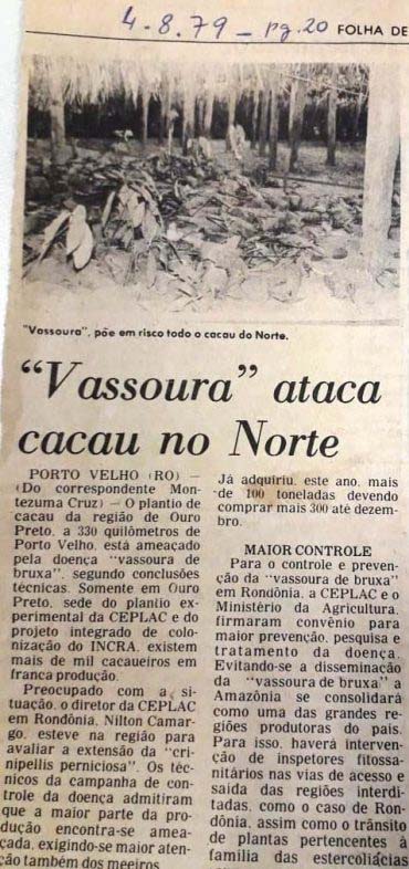 Em 1979, a vassoura de bruxa (Crinipellis perniciosa) atacava fortemente os cacaueiros de Ouro Preto do Oeste, e logo espalhava-se também por Ariquemes. O diretor da Comissão Executiva do Plano da Lavoura Cacaueira (Ceplac), Nilton Camargo, constatava a contaminação da maior parte das lavouras.