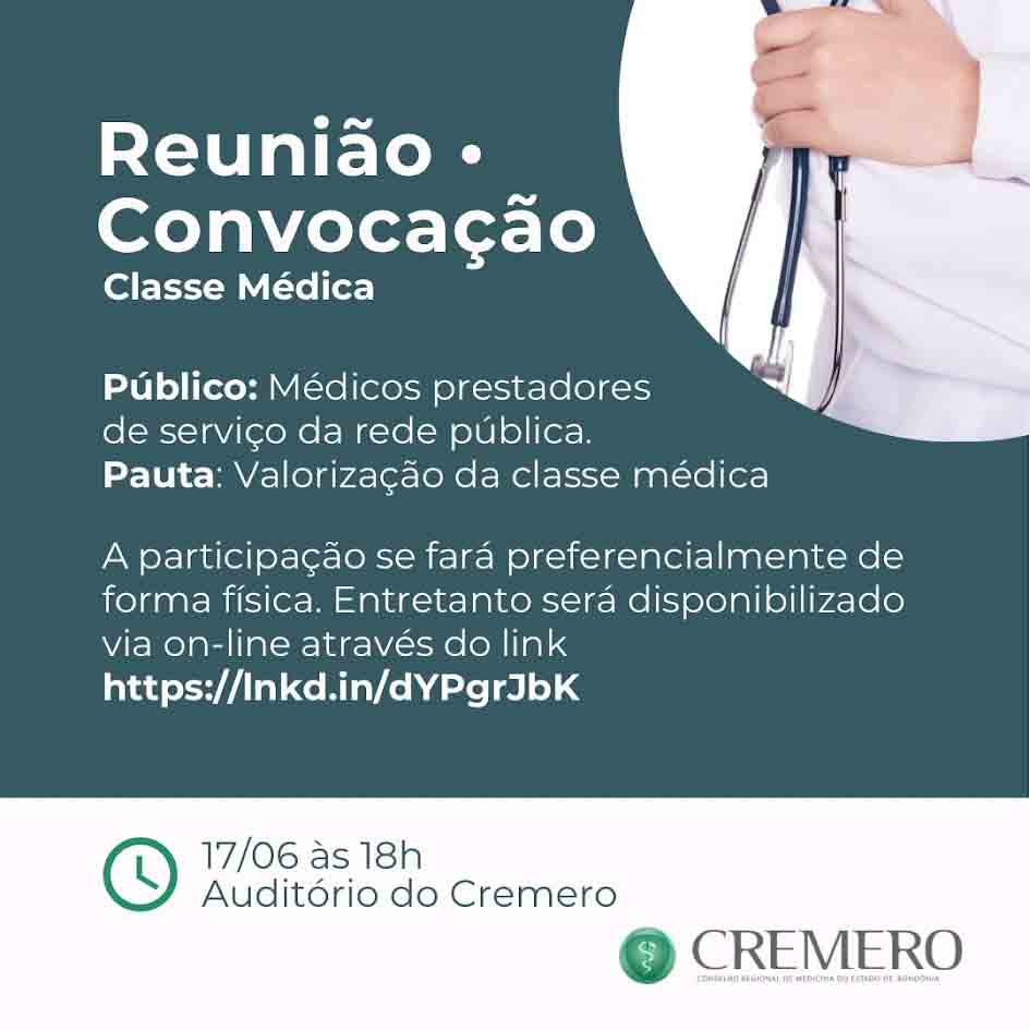 O Conselho Regional de Medicina do Estado de Rondônia (Cremero), promove nesta segunda-feira (17), às 18 horas, mais uma reunião com a classe médica prestadora de serviço da rede pública e demais entidades representantes da classe.