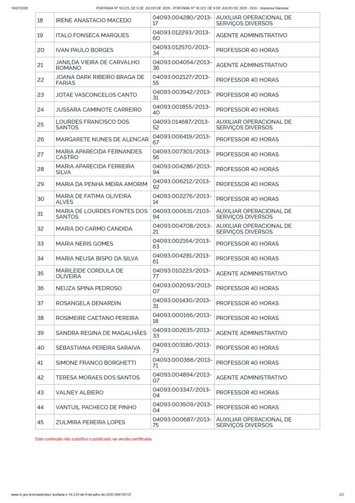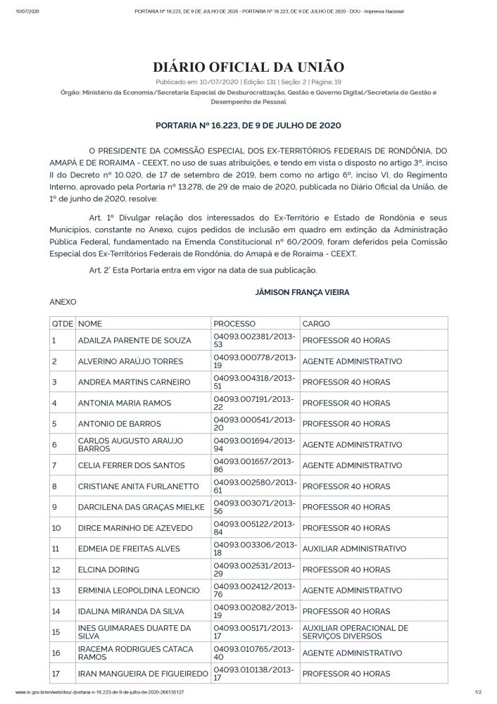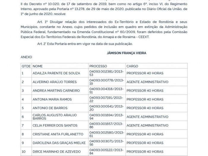 Diário Oficial da União publicou nesta sexta-feira (10/07), a Portaria nº 16.223, beneficiando 45 servidores de Rondônia com a Transposição. Esses servidores passarão a receber pela folha federal, após enquadramento.