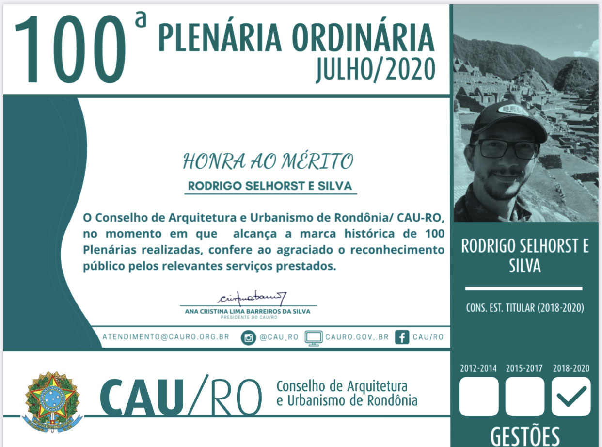 Por sua vez, o professor Rodrigo Selhorst foi homenageado pela docência da Arquitetura e Urbanismo e também pelo serviço prestado junto ao CAU-RO, enquanto conselheiro estadual titular (2018-2020).