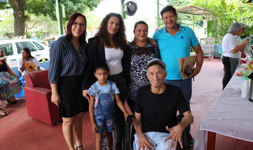 Uma situação rara foi registrada nesta sexta-feira (11) na Casa do Ancião São Vicente de Paula, em Porto Velho, com a reinserção ao núcleo familiar de Luiz Matias de Souza, 75 anos, acolhido em 23 de fevereiro de 2010 após sofrer acidente e ficar em situação de abandono no Pronto-Socorro João Paulo II. Para se despedir do senhor Matias, a direção da Casa promoveu um café da manhã com a presença da secretária de Estado do Desenvolvimento Social, primeira-dama Luana Rocha; a adjunta Liana Almeida; técnicos da Seas; Médico com Propósito, grupo formado médicos e enfermeiros que leva animação também aos pacientes em unidades hospitalares; além da dona de casa Estefânia Alves de Souza, que foi buscar o pai acompanhada do esposo Fernando Lacerda e da filha Ana Vitória, 5 anos.