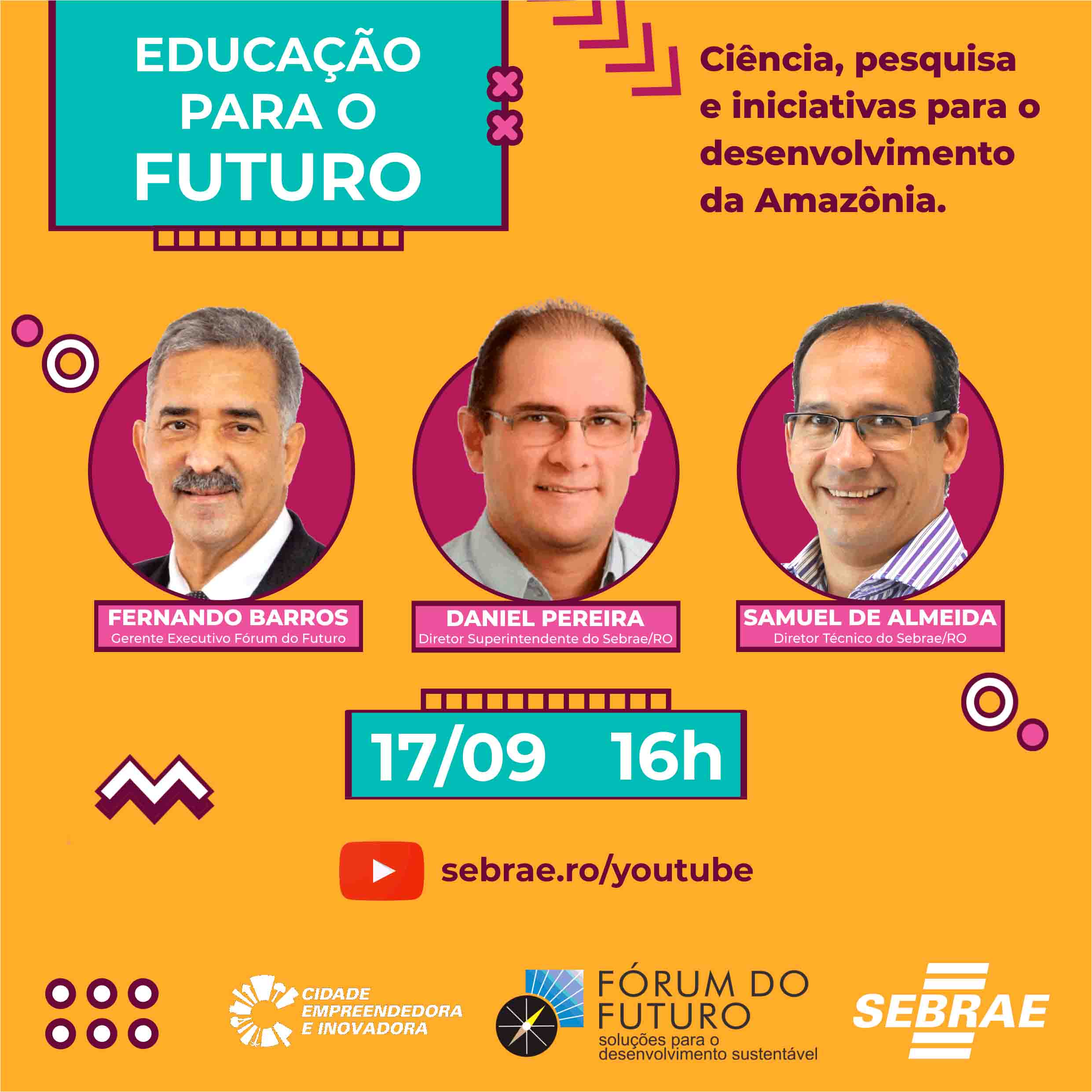 O evento Educação para o Futuro, idealizado pelo Sebrae em Rondônia, acontece dia 17 de setembro, a partir das 16h (horário de Rondônia) e será transmitido pelo canal do YouTube do Sebrae em Rondônia.