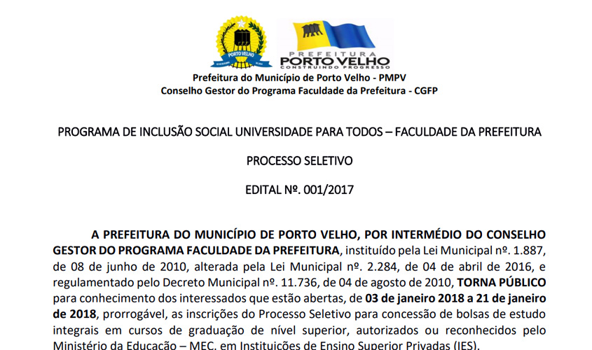 Estarão abertas no período de 3 a 21 de janeiro de 2018, inscrições ao processo seletivo para bolsistas integrais, para o primeiro semestre, em cursos de graduação de nível superior, através do programa de inclusão social Universidade para Todos – Faculdade da Prefeitura de Porto Velho.