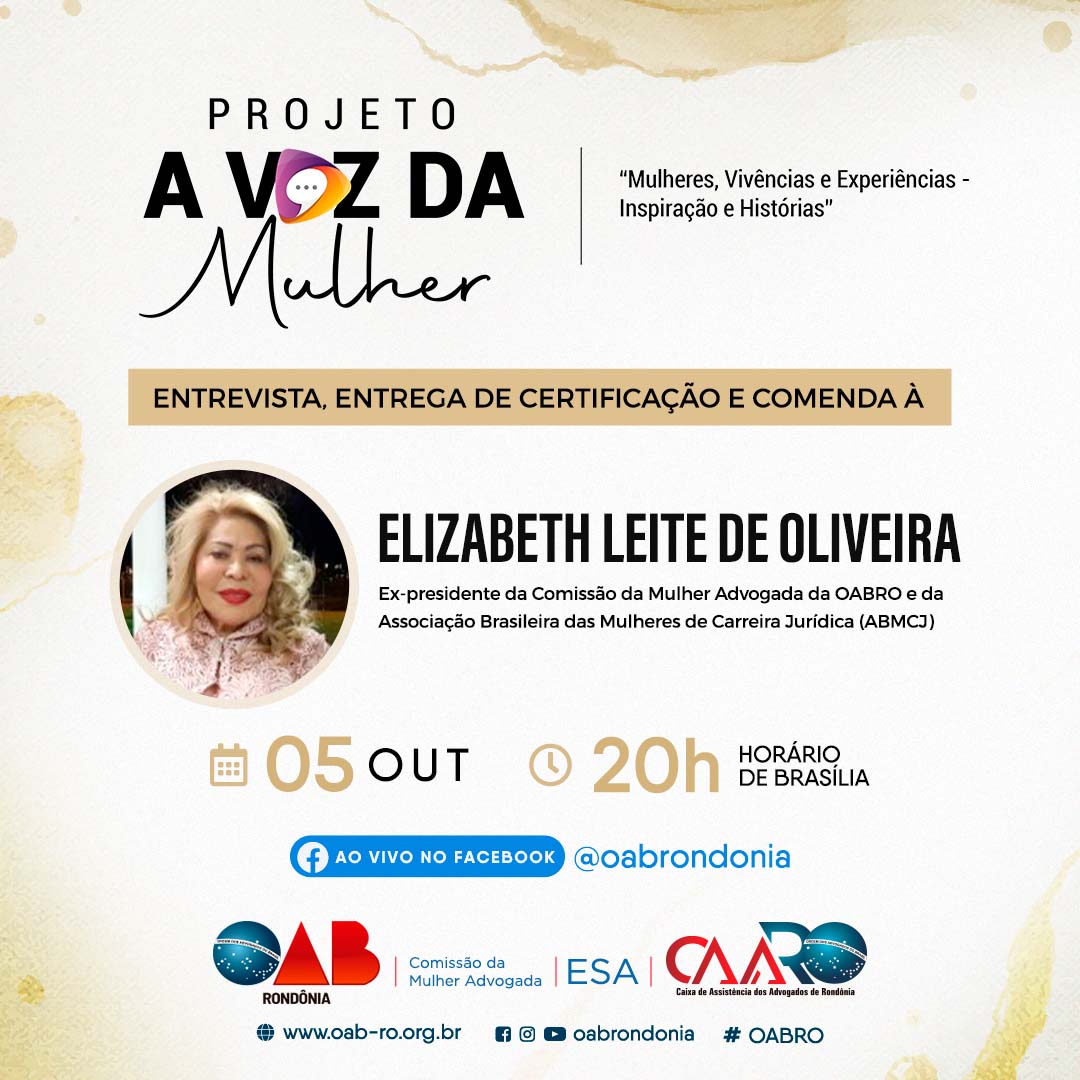 A quarta edição do projeto idealizado pela primeira vice-presidente da Comissão da Mulher Advogada, Glória Chris Gordon, homenageia Elizabeth Leite de Oliveira, nesta segunda-feira (05), através da plataforma Facebook @oabrondonia, às 19h (horário local)