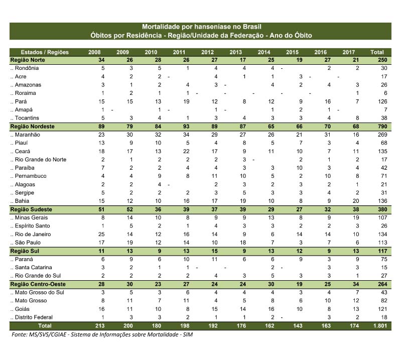 Carregada de estigmas, a hanseníase apresenta uma taxa de mortalidade relativamente baixa, em comparação com o número de casos diagnosticados no período. Entre 2008 e 2017, em todo o Brasil foram registrados 1.801 óbitos decorrentes dessa doença. O maior volume de mortes aparece no Maranhão (269), Bahia (136), Ceará (135), Rio de Janeiro (134) e Pará (126). Em Rondônia, foram 30 mortes, mais que 10% do total da Região Norte (250).