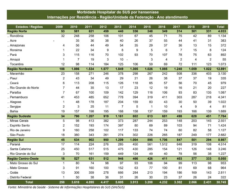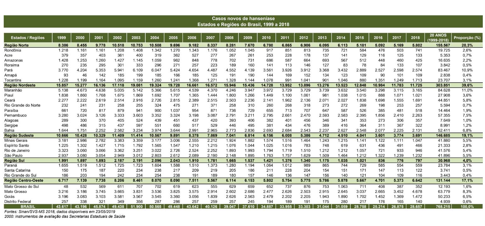 Nessas duas décadas analisadas, no Brasil, as maiores detecções de novos casos, em números absolutos, foram registradas no Maranhão (84.628 notificações); Pará (83.467); Mato Grosso (63.779); Pernambuco (57.355); e Bahia (52.411). Os dados foram apurados e avaliados pela Sociedade Brasileira de Dermatologia com base em informações da Secretaria de Vigilância em Saúde, do Ministério da Saúde.