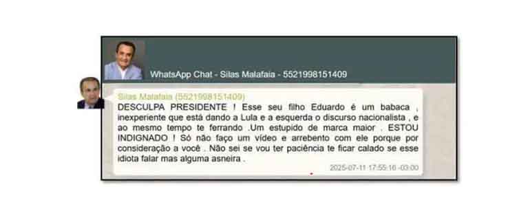 O pastor Silas Malafaia, em mensagem de áudio pelo WhatsApp ao ex-presidente Jair Bolsonaro, critica o deputado federal Eduardo Bolsonaro após os Estados Unidos anunciarem a imposição de tarifas de 50% aos produtos brasileiros.