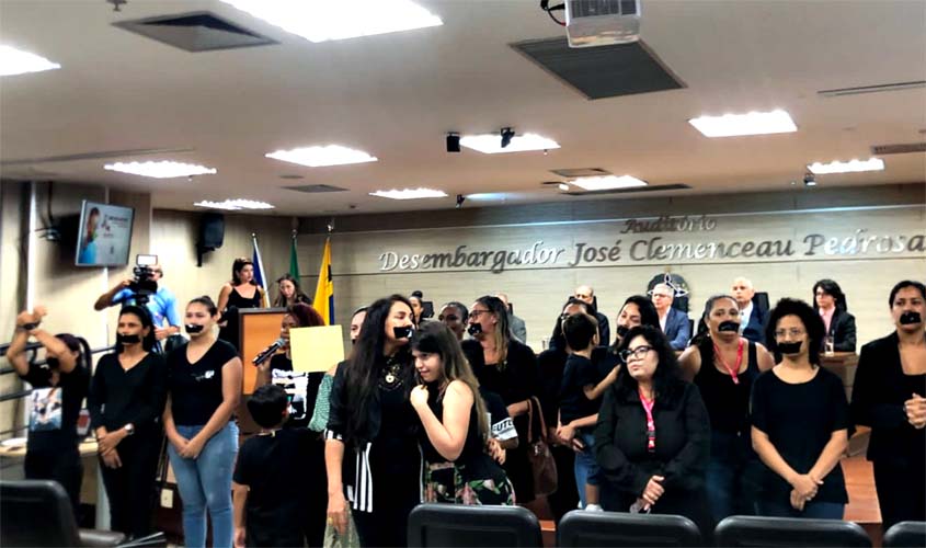 Um ato de protesto marcou a abertura do 1° Simpósio de Direitos da Pessoa Autista, na tarde desta quinta-feira (25), no auditório do Tribunal de Justiça de Rondônia (TJ-RO). Com roupa preta, tarja na boca e ‘mãos atadas’, um grupo de mães atípicas se manifestou virando as costas para as autoridades presentes na mesa, simbolizando a indignação pelos descasos e negligências do poder público com os direitos da pessoa com deficiência.