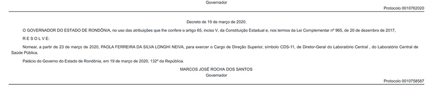 O governador Marcos Rocha trocou a direção Laboratório Central do Estado, o LACEN. Saiu o biotecnólogo Júlio César Ferreira da Silva e assumiu a advogada Paola Ferreira da Silva Longhi Neiva, nora do deputado estadual Izequiel Neiva, aquele da ponte, lembra?