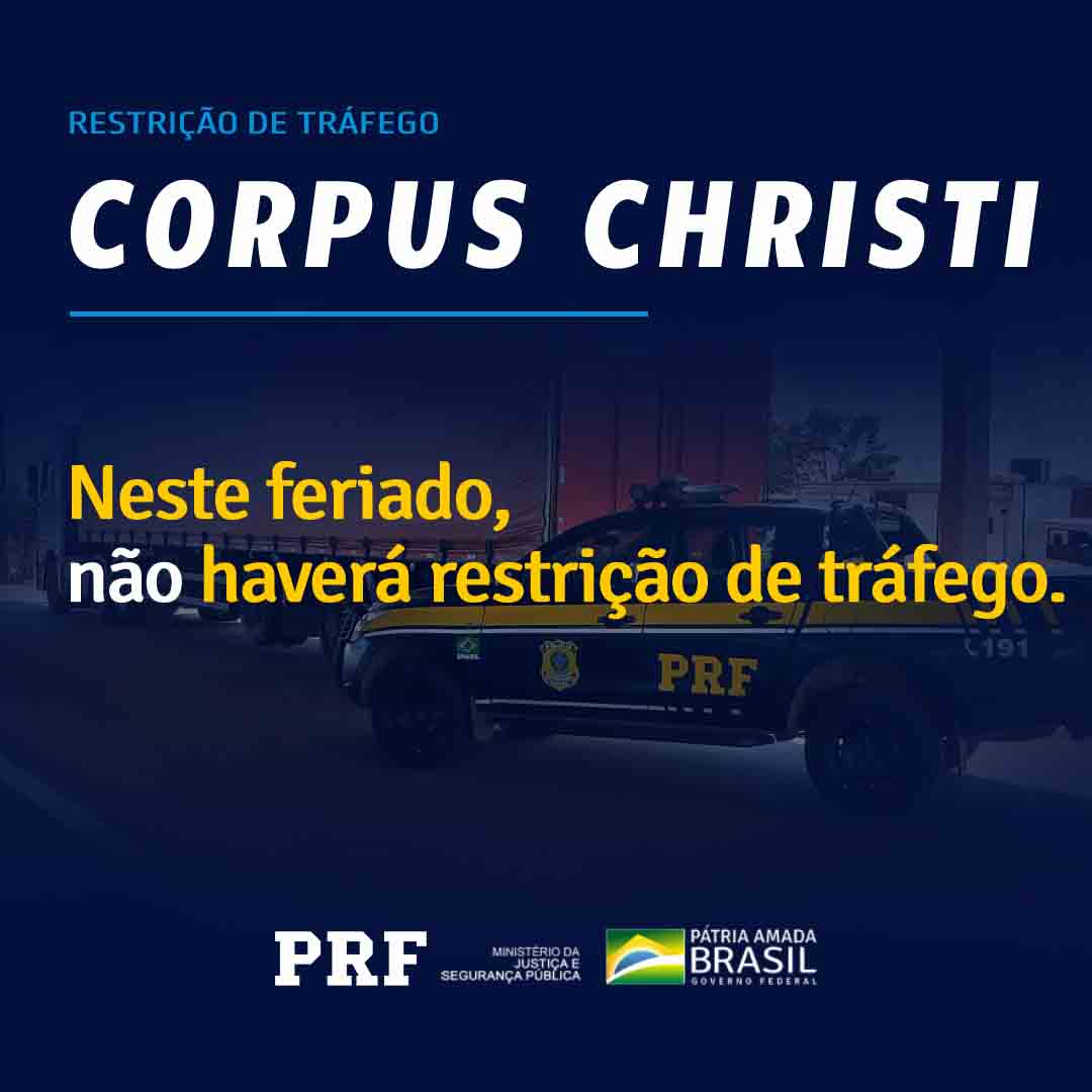 A Operação Corpus Christi 2021, realizada pela PRF em todo o território nacional, teve início às 00h00 desta quarta-feira (02) e seguirá até às 23h59min do domingo (06). Neste período, a Polícia Rodoviária Federal promoverá reforço concentrado no policiamento ostensivo preventivo em locais e horários de maior incidência de acidentes graves e de criminalidade, de acordo com as estatísticas, para garantir aos usuários das rodovias federais segurança, conforto e fluidez do trânsito.
