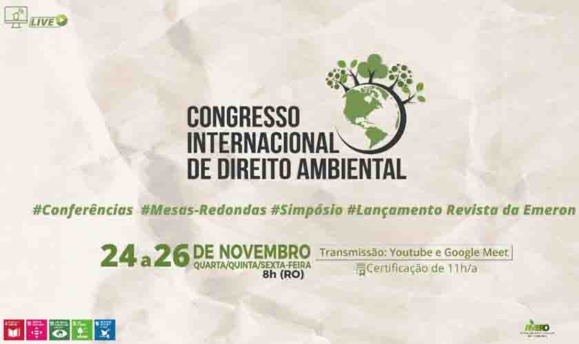 Entre os dias 24 e 26 de novembro, a Escola da Magistratura do Estado de Rondônia (Emeron) realiza o Congresso Internacional de Direito Ambiental, atividade de encerramento da Pós-graduação Lato Sensu em Direito Ambiental. O evento, aberto ao público e transmitido ao vivo pelo Canal da Emeron no Youtube (youtube.com/EscolaEmeron), reunirá grandes juristas em conferências e mesas de debates, além de seminários de apresentação de artigos.