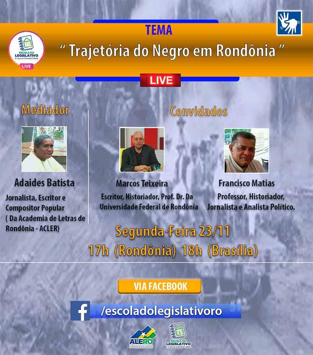 Na tarde de hoje (23) a Escola do Legislativo, da Assembleia Legislativa (ALE) promove live com o tema “Trajetória do Negro em Rondônia”. Assunto dos mais comentados nas redes sociais e na mídia em geral, a discriminação racial, que continua sendo uma barreira para o pleno exercício da democracia, será discutida amplamente por convidados identificados com o assunto em pauta.